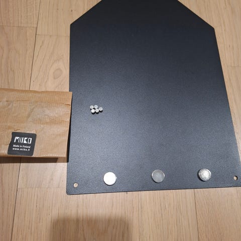 Magneettinen lasitaulu. Mukaan tulee kolme valkotaulutussia ja kaksi magneettia. Lähes erinomainen kunto. Etupinnalla vain pieni tumma viiva, joka ollut ostettaessa (kuvassa magneettien vasemmalla puolella). Kääntöpuolella on jälkiä, mutta jäävät piiloon seinään asennettaessa.