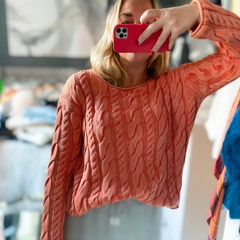 Keväisen kaunis pirteä oranssin värinen ohut neuletunika. Koko 40, mutta joustaa hyvin, niin sopii koolle 38 - 42. Mekon pituus keskietu 87 cm, olkapäältä alas "liehukkeen" helmaan asti 117 cm. Hihan pituus 71 cm. Ohutta neuletta, niin on joissakin kohdin lagoista tarttunut koruihin, mutta langat saa hyvin venytettyä takaisin tai käännettyä virkkuukoukulla nurjalle puolelle. Ei nukkaantumista. Neuleessa upeasti laskeutuva kaulus!