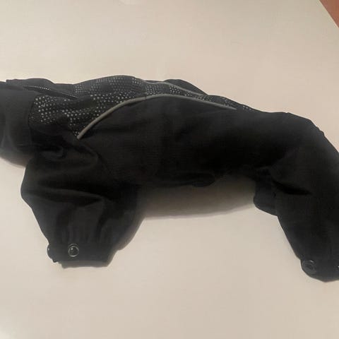 Selän vetoketjuista saa aukon valjaista tulevalle hihnalle.