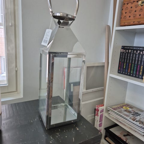 Uusi, joululahjaksi ostamani, jäi antamatta. Korkeus 33 cm, leveys alhaalta mittasin 22 cm. Lasisen osan korkeus 8 cm ja halkaisija 9 cm.