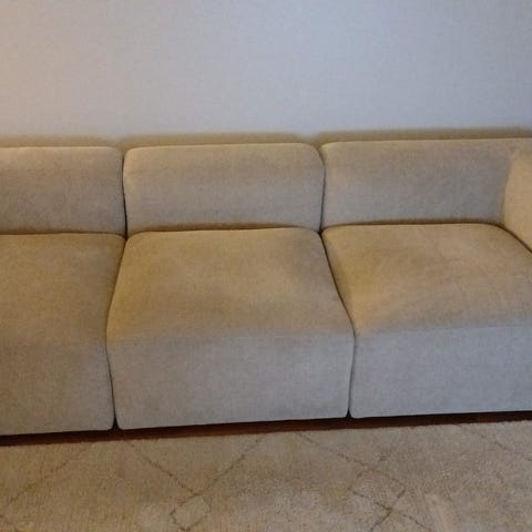 Kolmen istuttava sähkösäätöinen sohva, jonka jokainen istuin- ja selkänojaosa liikkuu erikseen itsenäisesti haluttuun asentoon, jopa makuuasentoon. Ei kaadu taaksepäin makuuasennossakaan. Vahva kangas, ehjä ja puhdas. Erittäin vankkarakenteinen teräsrunko. Jokaiseen yksittäiseen istuin-/selkänojaosaan on täysmittainen vahvasta kankaasta tehty suojapäällys (ovat pesty puhtaaksi), joten kokonaisuus on puhdas ja ehjä. Muutossa koko sohva oli purettuna ja kaikki liikkuvat osat puhdistettiin ja voideltiin.