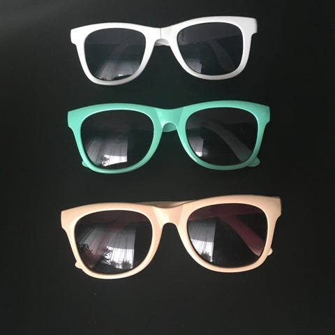 Neljät aurinkolasit, teinitytön kaapista poistoon joutuneet.