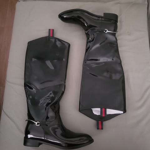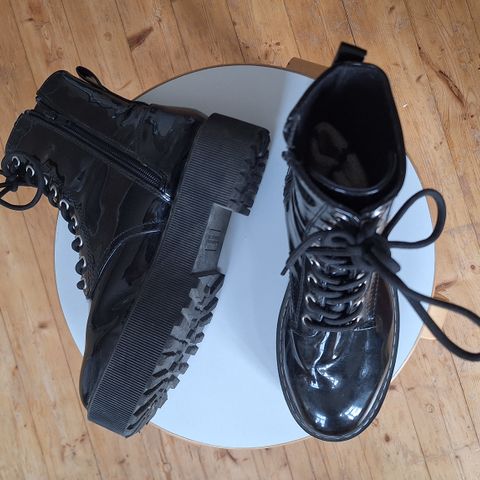 Saapikkaat, mustaa kiiltonahkaa/ pvc, vetoketjulliset, paksupohjaiset ja tolppakorkoiset. Hyvä kävellä. Kerran käytetty. Kuin uudet.
