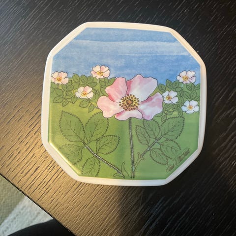 Arabia seinämaljakko, jossa on kukkakuvio. Maljakko on valmistettu posliinista ja siinä on kiinnityskoukut seinälle ripustamista varten. Maljakon korkeus 15 cm ja leveys ylhäältä 13 cm