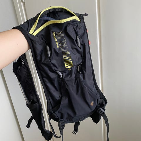 Musta, isohkolla sisätilalla, molemmin puolin verkkokangas tasku, sekä yläosassa lompakko/avaintasku. Ylhäällä keskellä aukko juomapussin letkua varten.