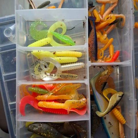 Käyttämättömiä tai erittäin vähän käytettyjä. Paketissa jigejä, jigipainoja/koukkuja, siimaa... Irtokoukkuja on varmaan 30-40 kpl