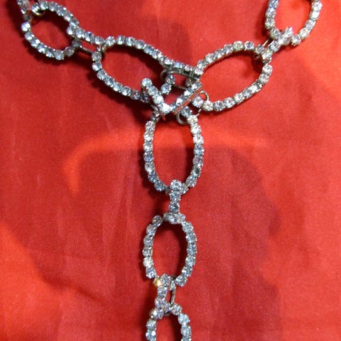 Näyttävä kaulakoru. Strasseja, helmiä ja korumetallia. Strassit kirkkaampia luonnonvalossa kuin valokuvassa. Ei ärsytä ihoa.