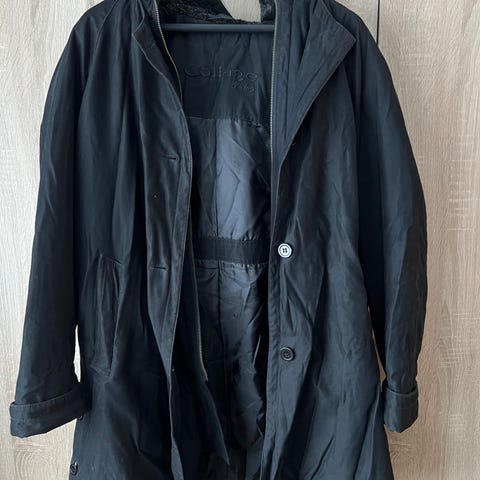 Musta puoli pitkä Takki, koko 36, edessä vetoketju, huppu, jossa nauhat, edessä vetoketju taskut, napillinen povitasku, mitta kainalosta kainaloon, materiaali 100%polyesteria, vuori 100%polyesteria, mitta kainalosta kainaloon 54 cm edestä mitta, hihan mitta kainalosta hihan suuhun 53 cm, mitta olalta helmaan 84 cm, hyvä.