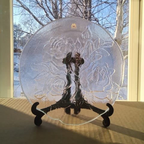 Muurlan lasilautasia 2 kpl, halk. 19 cm. Ruusukuvio. Toisessa tarra tallella. Hyväkuntoiset. Yht. 15 e. toridiili/ nouto.