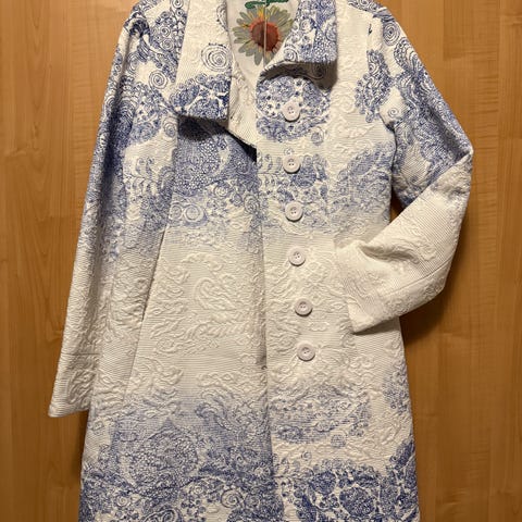 Desigualin mustavalkoinen polvipituinen välikausitakki. Muutaman kerran käytetty, uutena 220€.