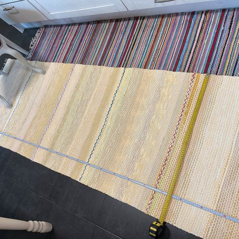 Myydään uusi juuri kangaspuilla kudottu kellertävä räsymatto. Käy esim WC matoksi, kynnysmatoksi.