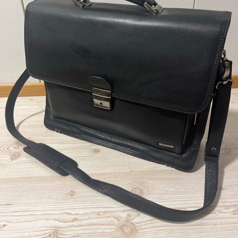 Musta nahkainen asiakirjasalkku olkahihnalla.