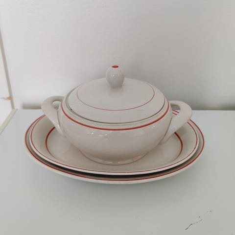 Punaraita-sarjan liemikulho. Koko 27/20 × 9,5 cm. Vetoisuus noin 1,9 litraa. Pohjassa halkeama lasitteen alla, lasite ehjä. Postitus postituskulut lisäten hintaan. TAI NOUTO INKOOSTA. Maksu MobilePay tai käteinen. Myös toridiilillä.