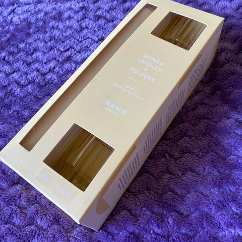 Kaksi lasista sinistä kynttilän jalkaa. Jalat hyvässä kunnossa. Voi laittaa vaikka pattereilla toimivat pitkät kynttilät jos ei halua käyttää oikeita. Mukaan tulee 4 mansettia ja kaksi jouluisempaa maksettua. Kynttilät eivät tule mukaan