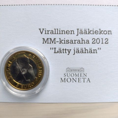 Viiden euron nimellisarvoinen kaksimetallijuhlaraha vuodelta 2012 Jääkiekon MM-kilpailut pahviseen kolikkokehykseen suojattuna.