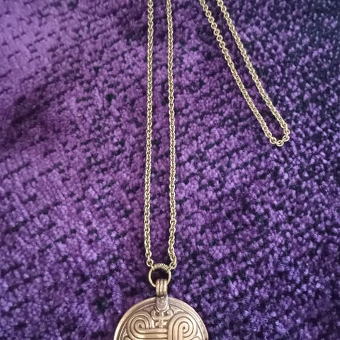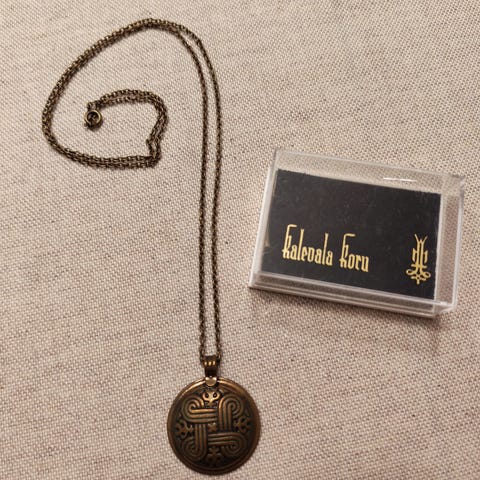 Perinteikäs Kalevalakoru ja Hannunvaakuna - riipus. Pronssia, riipuksen halkaisija noin 3cm ja vankemman papuketjun pituus noin 60cm. Hyvä käytetty kunto. Ei enää Kalevalakorun valikoimassa.
