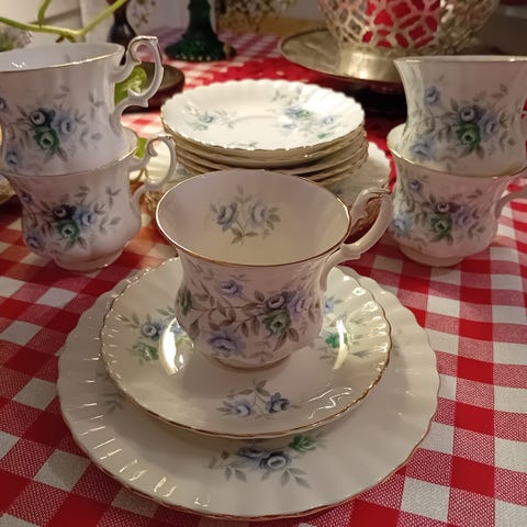 Myydään ylelliset englantilaiset Royal Albert Antoinette kahvikupit 6 kpl. Käyttämättömät.