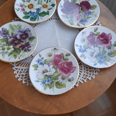Myydään koristeeksi jääneet kermansaven 5kpl aamiaislautasia/lautasia. Lautaset hyvässä kunnossa,jokaisessa on vaan teosta jäänyy yksi/2 pistettä en tiedä miksikä kutsutaan. Saa myös 6kpl mutta siinä kuudennessa naarmu
