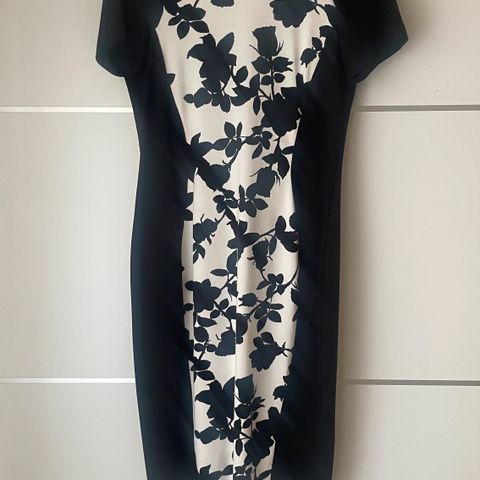 Käytämätön kotelomekko. Väri on musta, helmalla tummanoranssit ja tummanruskeat leveät raidat. Materiaali on trikoota, 73% polyesteria, 22% viskoosia, 5% elastania