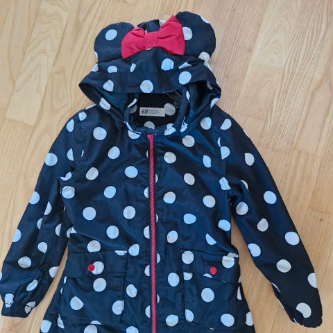 H&M:n Minniaiheinen kevyt tuulitakki koossa 110. Irrotettava huppu painonapein. Vetoketjukiinnitys. Avonaiset etutaskut. Hihansuissa kuminauharypytys. Siisti.