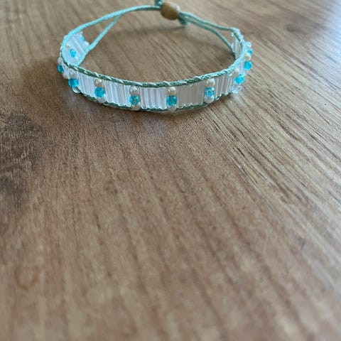 Punottu helmirannekoru, pituus 20 cm. Kiristysvaraa 8 cm.