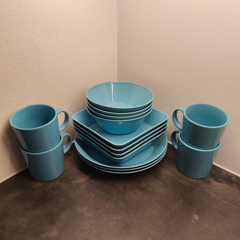 Teema mukit, 3kpl turkoosi ja 3kpl valkoinen. Myydään settinä 30e. Kaikissa ei tarroja.