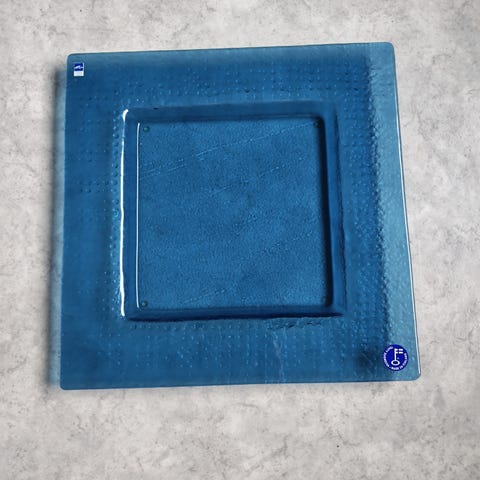 Vihreä lasilautanen, jossa on koristeellinen kuviointi. Lautanen on muodoltaan epäsäännöllinen ja siinä on kolmiomainen muoto. Sopii koristekäyttöön tai tarjoiluun.