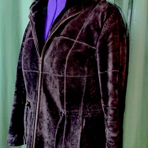 Myydään tosi hyväkuntoinen mokkanahkatakki.Kai-kai n.55cm ja olka-helma 60cm.