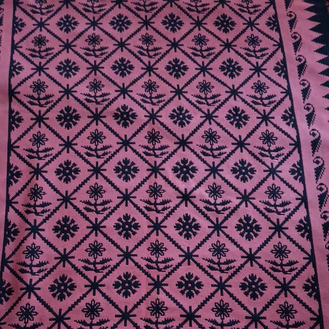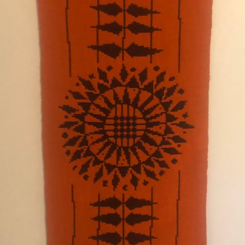 Sinivalkoinen täkänä 60- luvulta. Kangaspuissa kudottu. Voi käyttää molemminpuolin. Suunnittelija ei ole tiedossani.