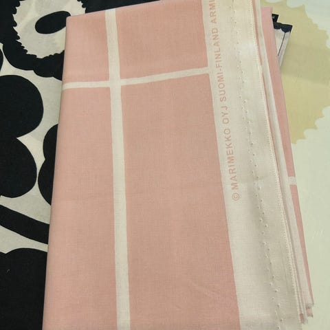 Heinikko kangas, luonnonvalkoinen pohja. Kauniit sävyt vihreä, viininpunainen ja vaalearoosa. Mmm