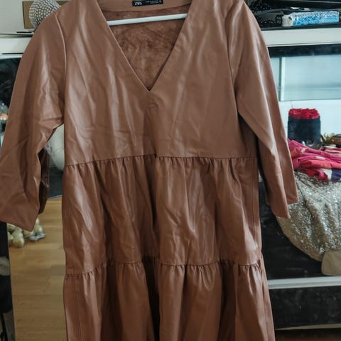 ZARA tyylikäs ja ajaton musta mekko nahkasomistein. Koko L (menee 38 ja 40 kokoiselle). Mekon materiaali on sellaista mokankaltaista säämiskää, jossa hihoissa sekä taskunreunoissa on tekonahkaa koristeena. Mekko on erinomaisessa kunnossa! kangas on joustavaa ja se laskeutuu kauniisti, koska kankaassa on painoa.
