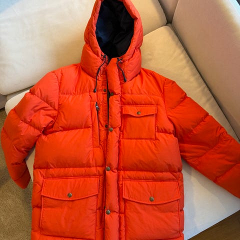 Keltainen untuvatakki Gantilta. Mallin nimi on "Alta Down Jacket". Täyte on 90% untuvaa ja 10% höyheniä. Takki on aika paksu ja lämmin, ja itse olen pärjännyt tuolla oikein hyvin koko talvikauden Etelä-Suomessa. Takki on juuri pesty ja erinomaisessa kunnossa: ei repeämiä kankaassa, ja vetoketjut toimivat hyvin. Hihansuissa on pientä värjäytymää nahkahanskoista, kts. kuvat. Kokomerkintä M, ja istuvuus vastaa myös hyvin tuota kokoa. Kainalo-kainalo noin 60 cm, vaikka tosin untuvatakista tuota on vaikea mitata tarkasti. Olen itse 177 cm ja 73 kg, kuvissa näkyy miten takki istuu minulle.