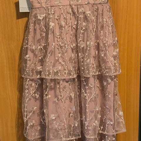Juhlava musta mekko jossa mm. pronssin ja hopean värisiä paljetteja edessä ja takana sekä myös sivuissa. Joustava vuorikangas. Ohut päälikangas laskeutuu kauniisti (kuvissa säilytyksestä johtuvaa ryppyisyyttä helmassa). Mukaan tulee musta hartiahuivi.