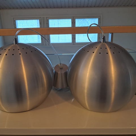 Brilliant kattovalaisin, kromirunko ja 4 huurrettua maitolasikupua. Valaisimia on kaksi samanlaista. Kaikinpuolin ehjät edelleen.