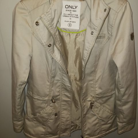 Iloisen keltainen naisten parkamallinen takki, merkki Only. Kokomerkintä M mutta pientä kokoa, vastaa mielestäni S:ää. Sopii kevääseen ja syksyyn. Ohut vuori.