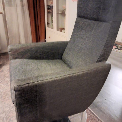No brand nojatuoli, jossa korkea selkänoja ja irrotettava niskatyyny. Vihreä kangasverhoilu ja valkoiset käsinojat. Sopii olohuoneeseen tai lukunurkkaukseen istuin- ja lepohetkiin.