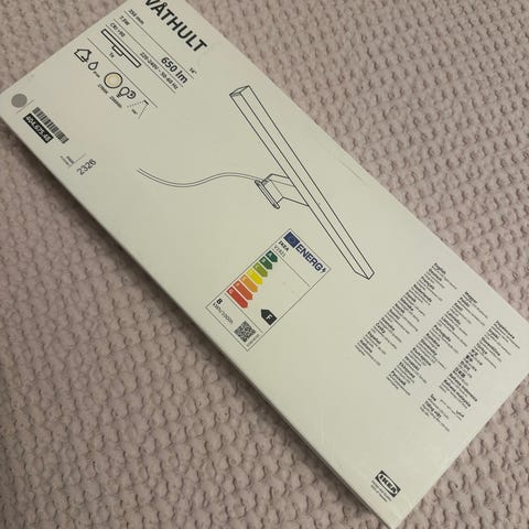 Ikeasta ostettu (ei enää myynnissä) valaisin peilikaapin päälle. Kiinnitetään kaapin päälle. Erittäin siisti, ja täysin toimiva. Sisällä toimiva loisteputki. Pituus 62cm, syvyys 15cm.