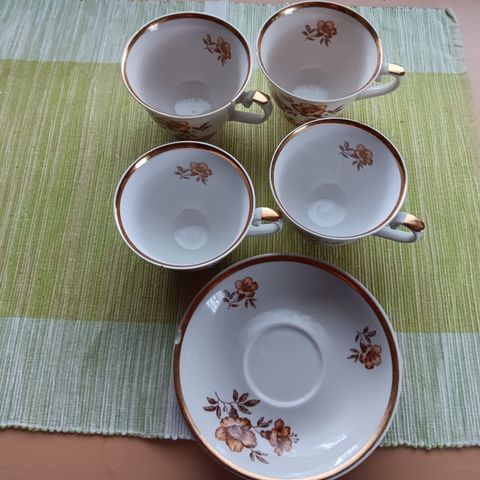 Myydään Arabian kulta-aika II kupit ja aluslautaset 2 kpl 8,5 euroa kuppi ja lautanen. Lisäksi 4 kuppiparia Myrnaa. Hinta 5 euroa kuppi ja aluslautanen. Aluslautasessa kulumaa. Näkyy kuvissa.