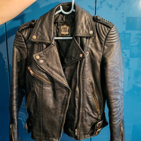 Noin 90-luvulla hankittu pehmeää hyvää nahkaa. Takissa kevyehkö välivuori, edessä 2 taskua, nahka ehkä ajanpatinoima, väri kolmannen kuvan mukainen lämmin väri, kevyehköt olkatoppaukset, vetoketju ja nepparit metalliset erittäin hyväkuntoiset. Takissa huppu, jonka reunassa karva. Huppu irroitettava. Hupun vetoketjun toinen puoli ei näy takissa pidettäessä ilman huppua (viimeinen kuva), olkapää helma 77 cm, kai-kai 70 cm, molempien etutaskujen ”sisäsuulla” tummat kohdat ikään kuin hintalappujen jäljiltä (näkyy kuvissa).