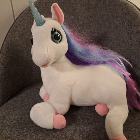 Isohko yksisarvis pehmo joka kertoo satuja. Särvi vilkkuu ja silmät räpsyy tarinaa kertoessaan. Harja kaipaa siistimistä, patterit lopuillaan.