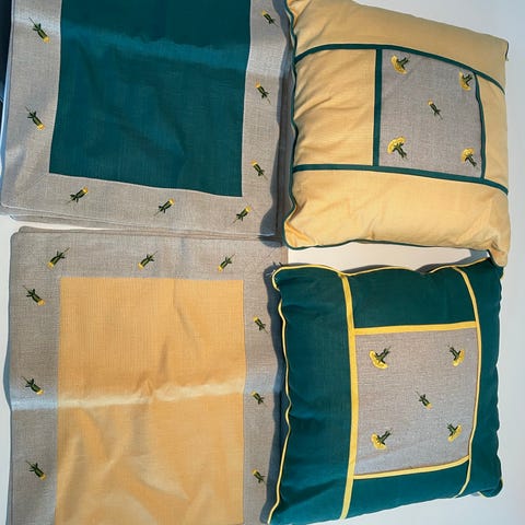 Koko 34 x 45 cm. Tabletit ovat molemmin puolin samanlaiset, välissä on flanellikangasta. Tabletit on huoliteltu ja kankaat ommeltu yhteen, mutta ne pitää vielä kantata.