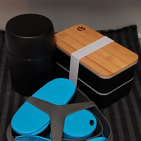 - ruokailuvälineitä; haarukoita 2 kpl, isoja lusikoita 6 kpl, veitsiä 3 kpl ja pieniä lusikoita 5 kpl, sekä teline näille ruokailuvälineille