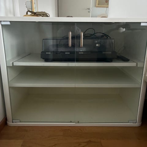 Lasiovellinen pieni kaappi missä 2 lasitasoa. Ollut stereoiden tasona
