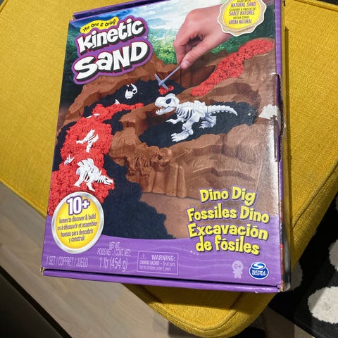 Osittain avaamaton ja käyttämätön Kinetic sand- pakkaus.