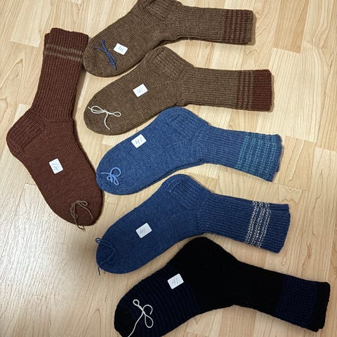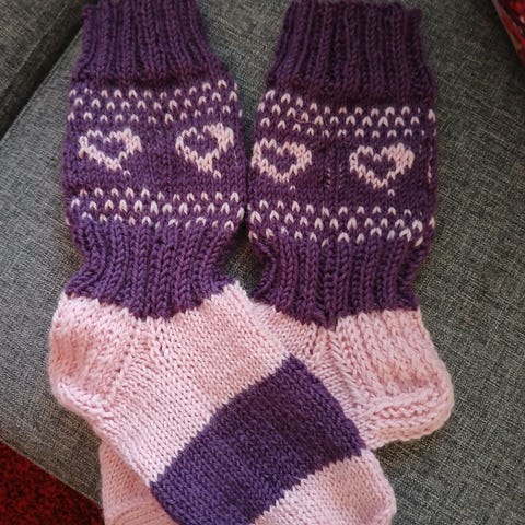 Kahdet 7 veljestä langasta tehdyt villasukat. Kestää konepesun. Koko 37, joissa pohjan pituus 22 cm, varren korkeus nilkasta 32cm ja koko 38, joissa pohjan pituus 24 cm ja varren korkeus nilkasta 32cm.