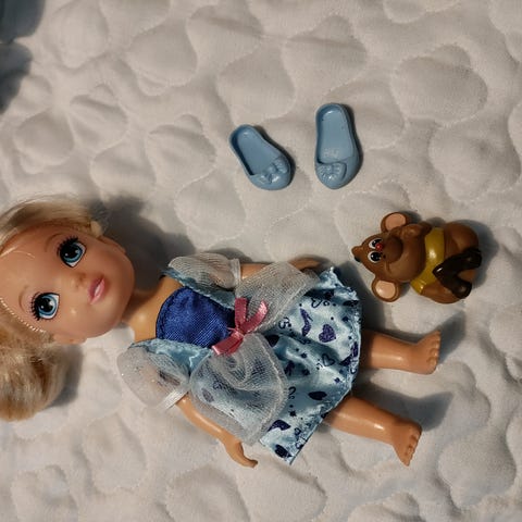 -Siisti ja ehjä, mutta siipien väri on kulunut ja väriä on täydennetty jälkikäteen kultamaalilla, kimalteella ja tarroilla (KATSO KUVAT, kiitos). Kullanvärinen hiusnauha ja hame on lisätty myös jälkikäteen eli ne eivät ole olleet nukella alunperin.