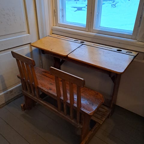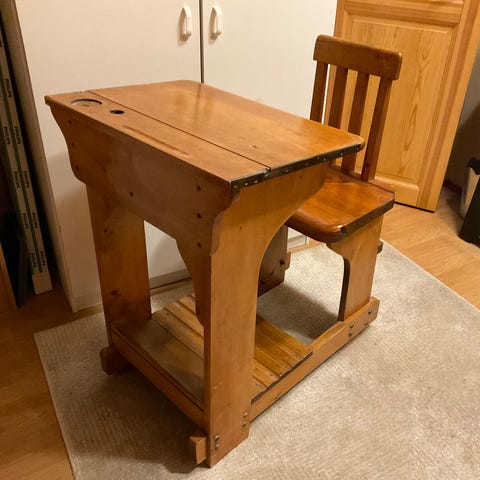 Myydään kuvanmukainen kahden istuttava vanha pulpetti. Maalattu valkoiseksi, pinnassa kulumaa. Pulpetin sisällä DC-FIX -tarrapaperi pohjassa. Penkissä rako, joka tuettu alta metallikulmalla. Kummallakin sivulla koukut. Saa tulla katsomaan ennen ostopäätöstä. Nouto.