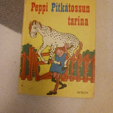 Peppi Pitkätossu -kirja vuodelta 1963, kuudes painos, kirjan kannet osittain rikki mutta muuten kirja on hyväkuntoinen ikäänsä nähden, kirjassa enimmäkseen tekstiä (ei kuvakirja)