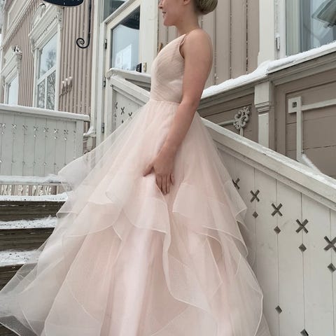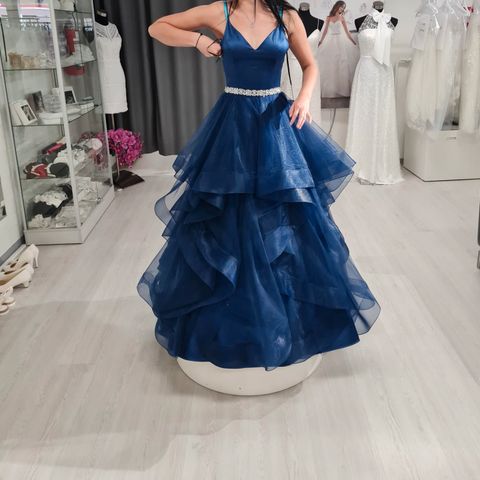 Zazabellasta ostettu petroolin sininen vanhojentanssimekko. Mekossa on tanssittu kahdet tanssit. Mekon olkaimia on lyhennetty, mutta ne saa purettua helposti. Mekossa on toppaukset, nyöritykset ja vetoketju, joten koon säätäminen on helppoa. Tanssin itse tennareilla ja olen 164 cm pitkä. Mekko oli itselle hieman pitkä joten menee myös pidemmälle. Vannehame tulee mekon mukaan. Koko 32. Itse käytän S-M kokoisia vaatteita. Sovittaminen onnistuu Sotkamo, Siilinjärvi/kuopio ja Joensuu alueella😊