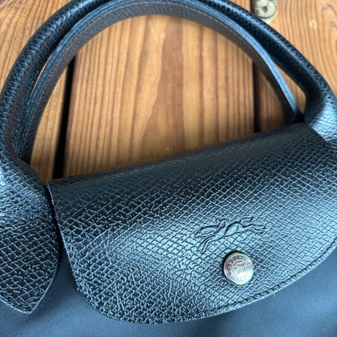 Viikonloppukaukku johon mahtuu tavarat. Vetoketjun vetimen Longchampin logo irronnut